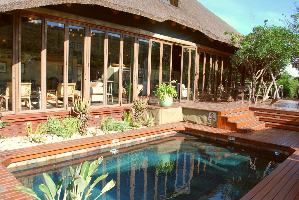 The central area had another pool and 5 star service. The food at Shamwari Game Reserve is all-inclusive and there’s lots of it. We were offered food so regularly that we struggled to eat it, but it really is a luxury experience. The lodge as lovely views of the reserve and it’s normal to see passing giraffes or warthogs from the viewing areas. Shamwari covers about 25,000 hectares in size and they don’t feed the animals – it’s a true natural habitat.